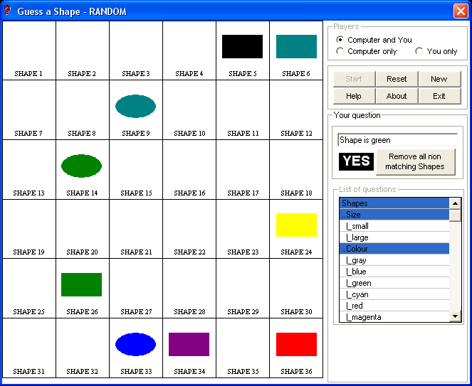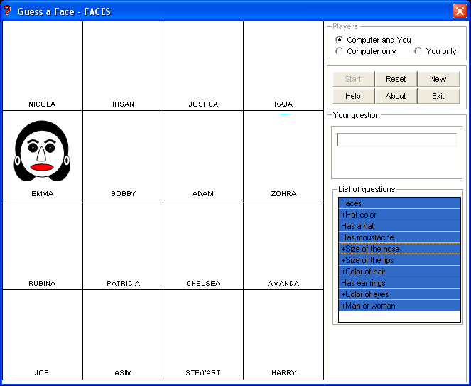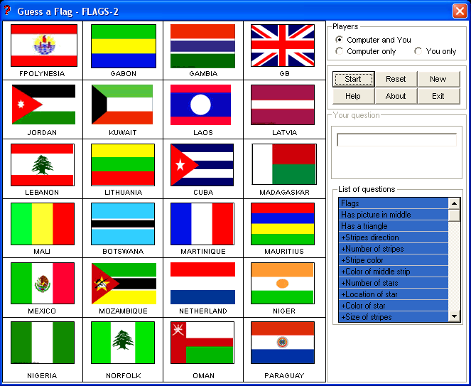 Gameplay revolves around a question-and-answer exchange: you pose a question from a curated list (for example, “Does the flag have a triangle in it?”), and the computer responds truthfully. Any items that no longer match the criterion are filtered out of your visible pool. Then it’s the computer’s turn to ask, and you must respond accurately to avoid giving away too much. This back-and-forth continues until one side correctly identifies the other’s choice.