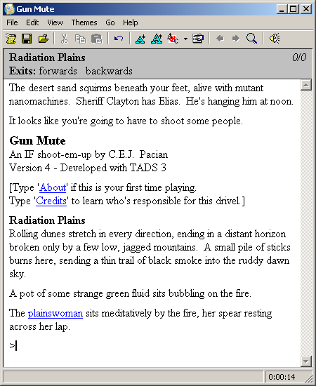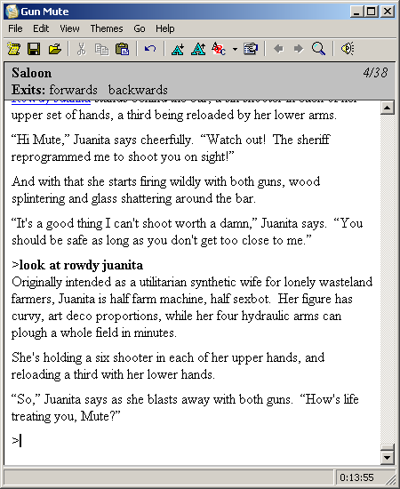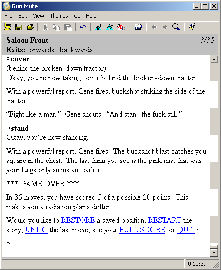 Gun Mute offers a lean, intense approach to interactive fiction by distilling its gameplay down to a handful of core mechanics: drawing, reloading, moving forward or backward, and taking cover. At first glance, the limited movement might feel restrictive compared to sprawling text adventures, but this tight focus turns each showdown into a tense, tactical encounter. Every decision—when to draw, when to duck behind a decaying barrel, when to risk a reckless advance—carries weight.