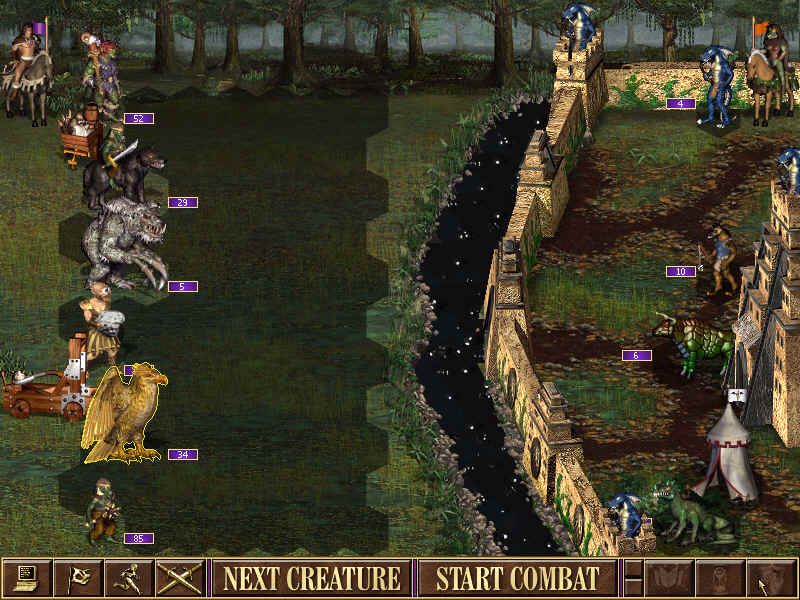 Leveraging the Heroes of Might and Magic III: Shadow of Death engine, Warlords of the Wasteland offers crisp, colorful 2D visuals that have aged remarkably well. The game’s isometric maps feature richly drawn terrain—lush forests, arid wastelands, and stormy mountain passes—all populated by detailed unit sprites. Each faction’s creatures animate smoothly, from the lumbering Ogres of Stronghold to the arcane Golems of Tower, giving battles a sense of weight and character.