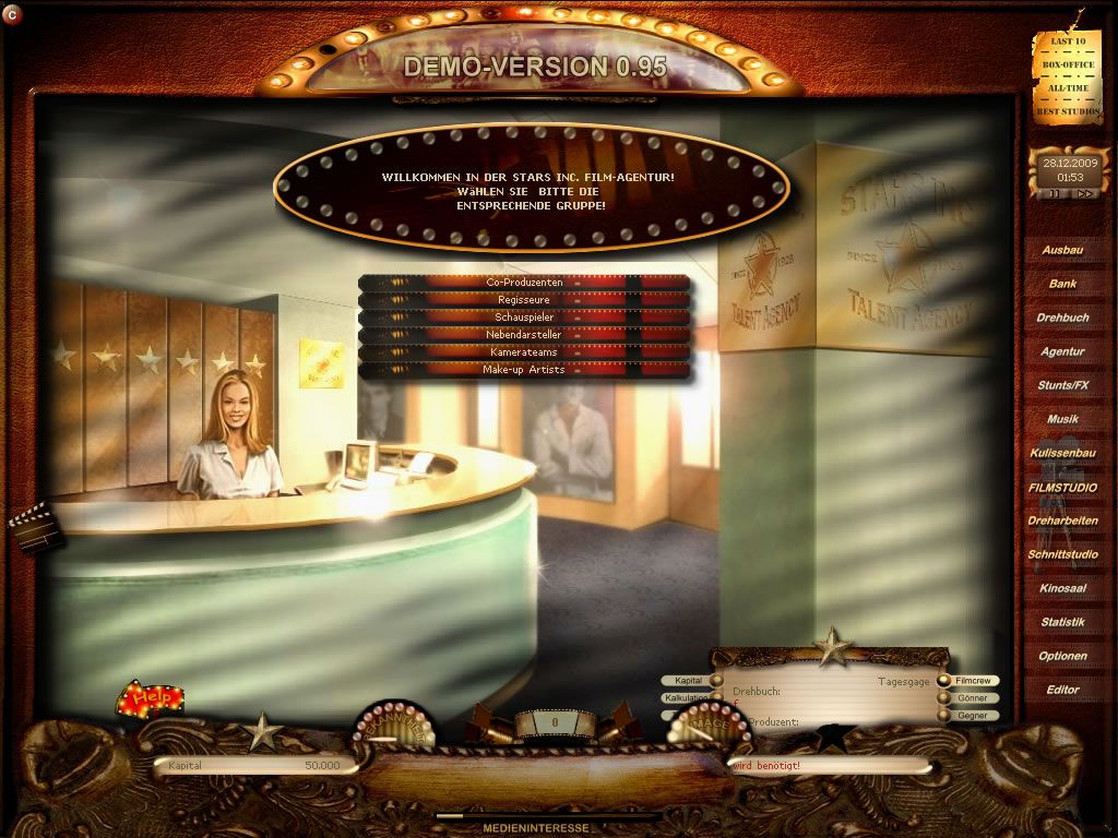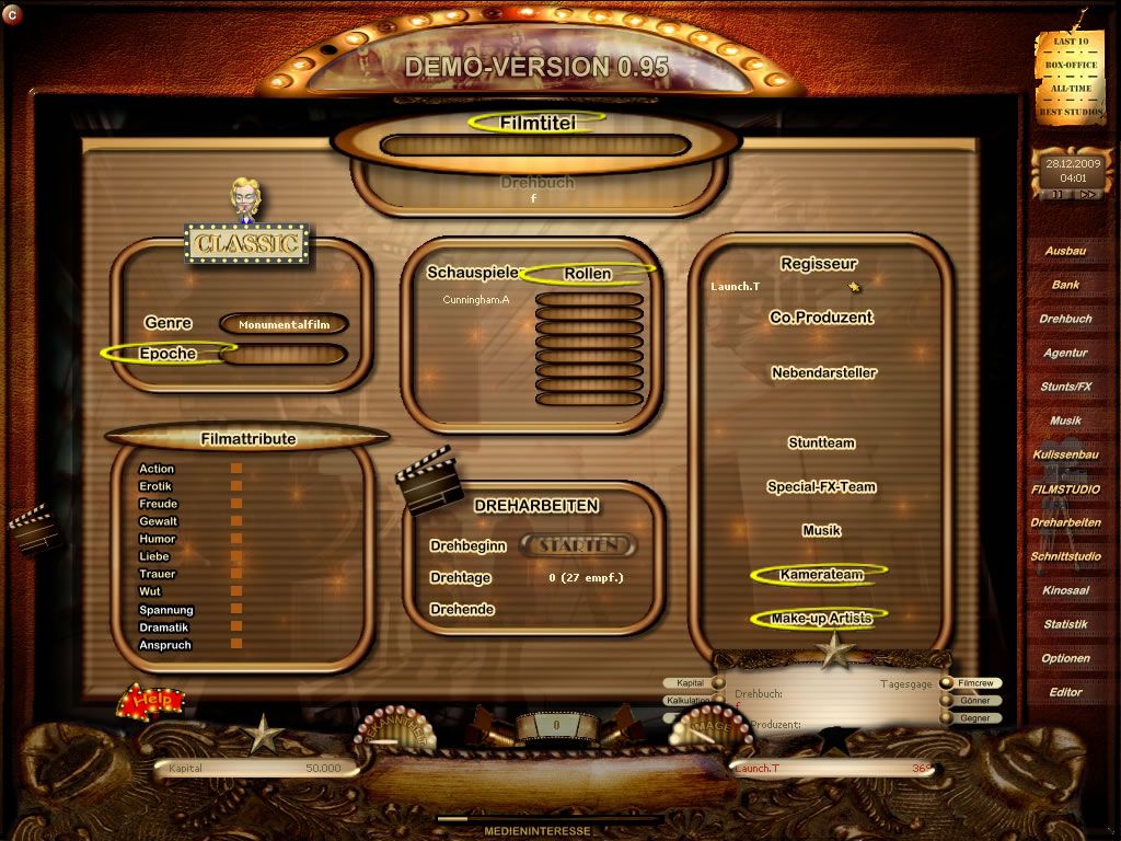 Once the script is secured, it’s time to assemble your cast and crew. Actors, directors, stunt teams, make-up artists and composers each bring unique stats and genre affinities to the table. A top-tier action star may command a hefty salary yet falter in a romantic comedy, so balancing competence, cost and genre fit becomes a core strategic challenge. Beyond personnel, you can expand your facilities—sound stages, editing suites or catering halls—to streamline production phases or boost staff morale. And for studios in a pinch, the option to borrow funds adds extra risk-reward calculus.