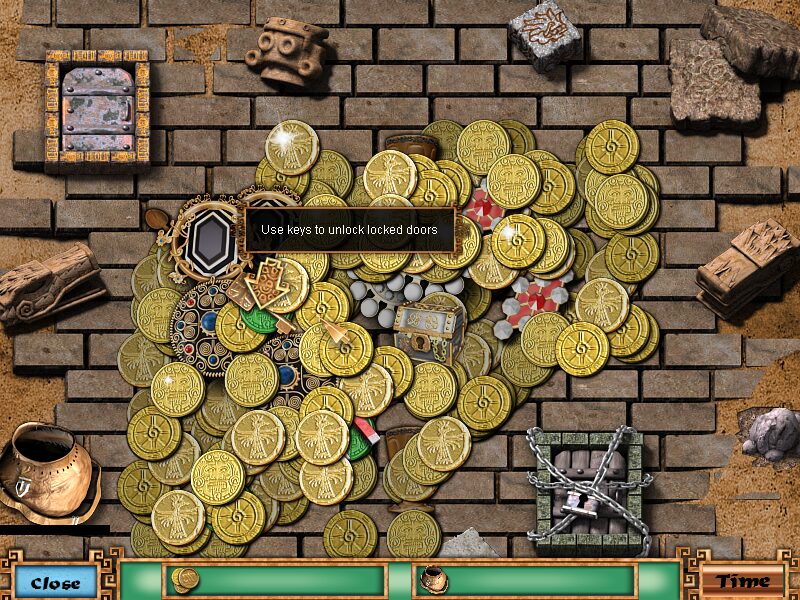 Inca Tomb delivers a straightforward yet addictive puzzle experience. At the core of each level lies a towering pile of gleaming gold coins, concealing precious Incan jewelry and relics. Your primary task is to click away coins from the top of the stack until the buried artifacts are revealed. Once an item is fully exposed, you drag and drop it into your open backpack. Clearing every relic triggers one of the exit hatches to open, granting access to the next tomb or a bonus mini-game.