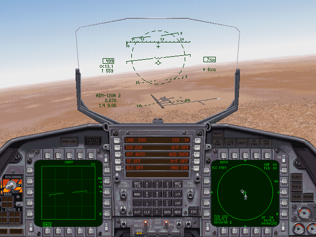 When you’re ready to wage war, the game’s campaign over Iraq and Iran unfolds across more than three million square miles of authentic terrain. Missions are based on actual Desert Storm sorties, complete with air-to-ground strikes, SEAD (Suppression of Enemy Air Defenses) runs, and close air support. Enemy SAM sites, mobile missile batteries, and hostile fighters all react dynamically to your tactics, demanding constant vigilance.