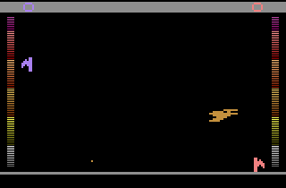 Visually, JoustPong embraces its retro Atari 2600 roots with chunky pixels and a limited color palette that evokes classic ’80s arcade cabinets. Paddles are rendered as simple rectangles with animated wing frames, and the ball remains a bright, square sprite that zips across the playfield. While the visuals don’t push hardware boundaries, they perfectly capture the era’s aesthetic charm.