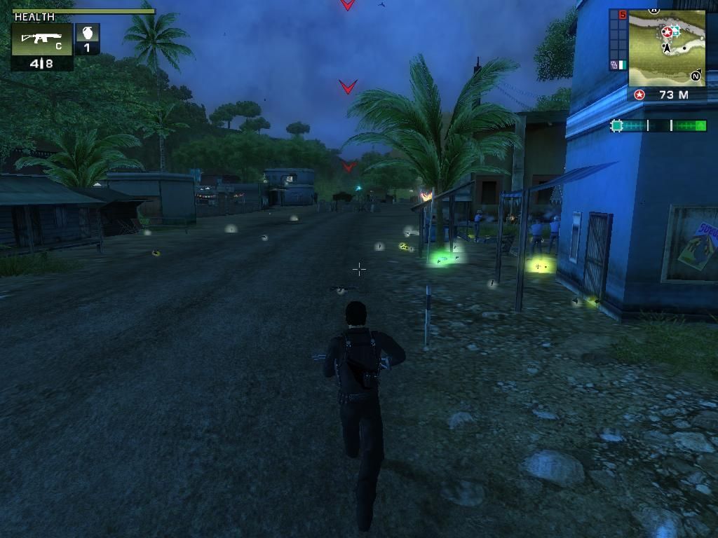 Character models and weapon effects carry a mid-2000s polish: while Rico’s animations occasionally feel stiff, the explosive destruction and particle effects are where the game shines. Buildings crumble piece by piece, vehicles burst into flames, and the smoke trails from missiles cut through the sky with convincing realism. Nighttime missions are especially striking, with searchlights piercing through jungle shadows and muzzle flashes lighting up the darkness.