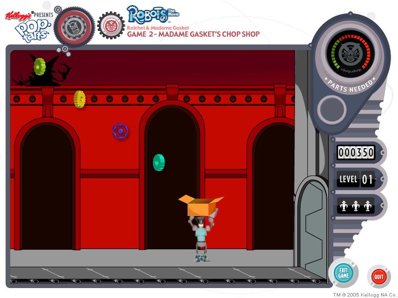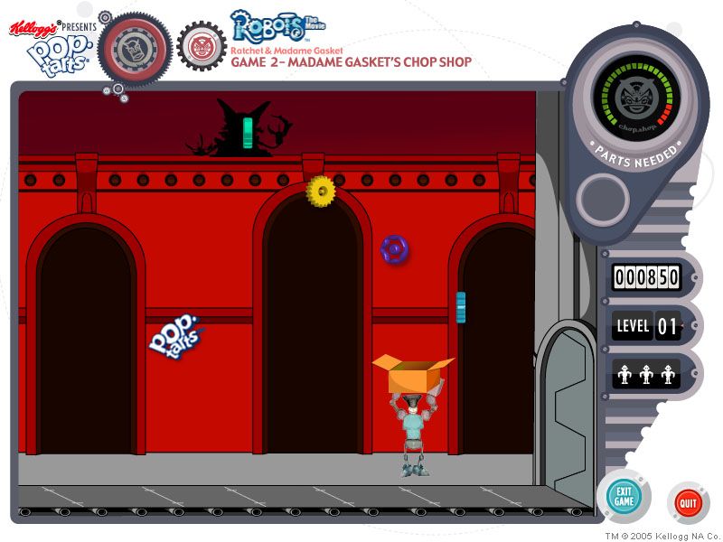 Visually, the game leans into the colorful, industrial aesthetic of the 2005 movie Robots. Character models and environment elements are rendered in bright, cartoony colors that echo both the film’s world and the Pop-Tarts branding. The sprites are clean and easy to read on screen, ensuring that scrap pieces and power-ups never get lost in the background clutter.