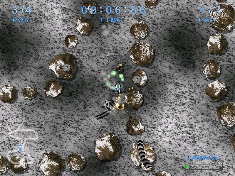 The game features eight distinct courses, from the sunbaked curves of Collision Canyon to the frosty hurdles of Snowcrash and The Ice Zone. Each track is defined by walls of rocks and boulders, which not only delineate the path but also serve as makeshift cover in firefights. Straying off-course is technically possible, yet it comes at the cost of skipped checkpoints and lost lap time. This risk-reward mechanic encourages players to stay on track while still allowing for desperate tactical retreats when under heavy fire.