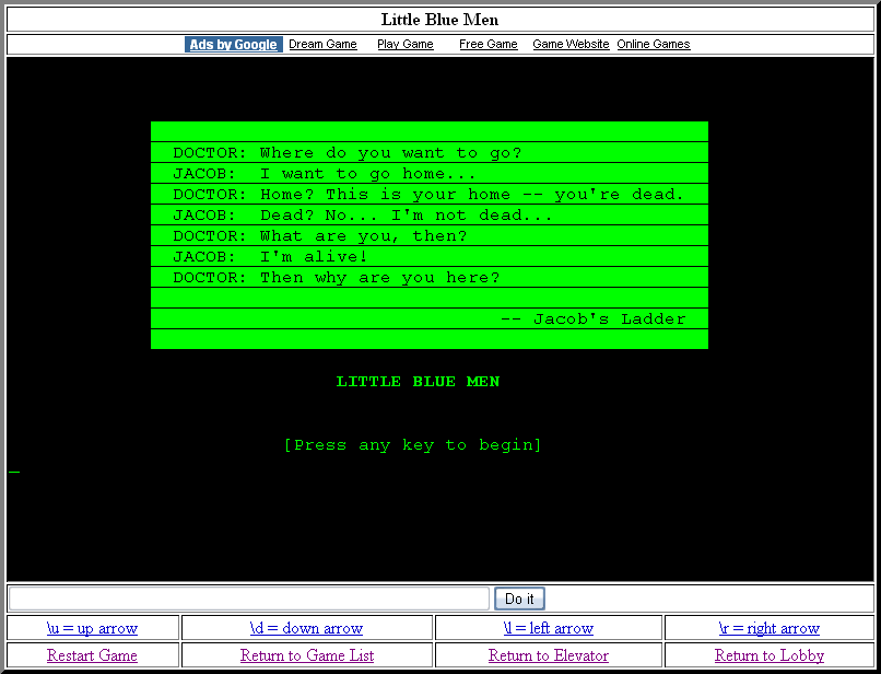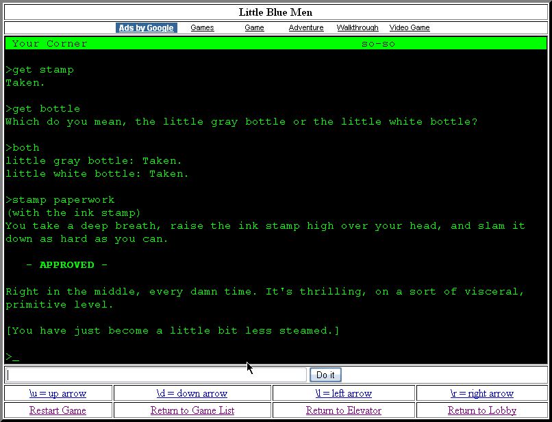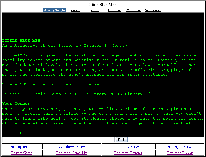 Little Blue Men places you squarely behind an office desk, transforming everyday paperwork into a subtle, twisting labyrinth of choices and consequences. As an interactive fiction experience, the game relies on text-based commands that feel both intuitive and oddly ritualistic: “stand,” “file,” “examine phone,” and so on. Each decision nudges you deeper into the department’s endless circuit of forms, memos, and the occasional burst of surreal horror—especially if you decide to pick up the silent phone.