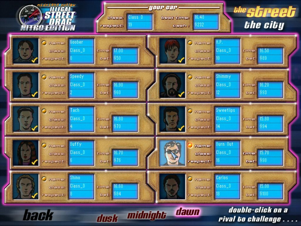 Between races, snippets of dialogue with rival drivers and garage contacts pepper the menu screens. You’ll hear trash talk from cocky challengers, get tips from fellow racers, and occasionally receive warnings about upcoming tournaments. While these lines are often brief and formulaic, they lend a sense of community—and rivalry—to the game world, reinforcing that urban racing culture vibe.