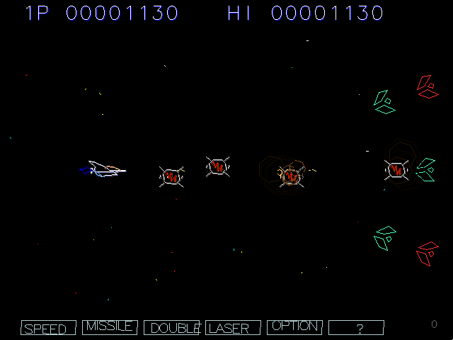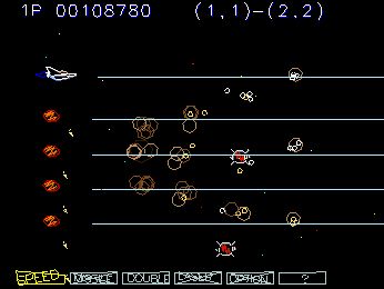 The power-up system is a standout feature carried over from the Gradius series’ menu-based mechanics. As you destroy enemies, they drop energy capsules that advance a selector along the bottom-of-screen menu. You decide when to cash in for a speed boost, satellite drone, missile volley, or devastating laser beam. Some upgrades stack to multiple levels, and the visual feedback (with crossed-out entries at max level) makes it clear what you’ve earned and what remains an option.