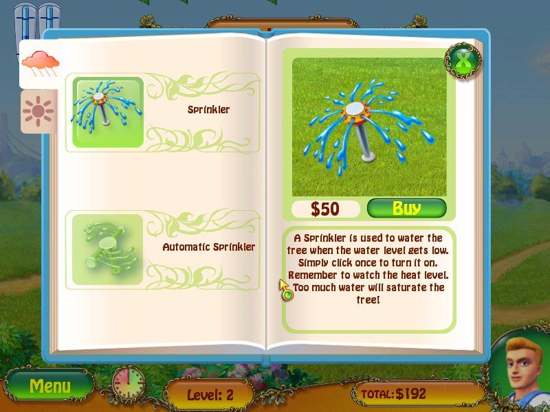 The user interface sits unobtrusively at the top of the screen: two slim gauges for water and temperature, a timer, and pocket-sized icons for your available tools. Tooltips pop up when you hover over an item in the catalog, complete with small illustrations and price tags. This clear presentation ensures you can quickly shop for sprinklers or insecticide mid-game without breaking your concentration.