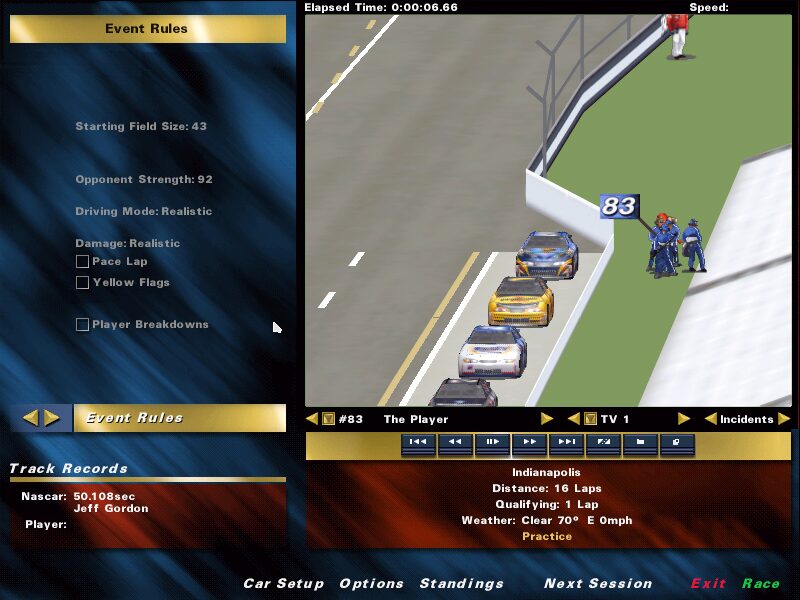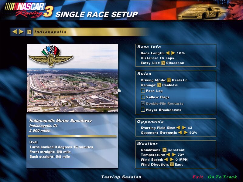 NASCAR Racing 3 builds on its predecessors by offering an unprecedented level of customization for race events. Players can select from full Winston Cup and Busch Grand National fields, choosing specific drivers, cars, and tracks to suit their preferences. Whether you want a short sprint or a grueling endurance contest, race length and AI difficulty are fully adjustable. You can even toggle full-course yellow flags and choose your preferred restart style, putting you in total control of every on-track scenario.