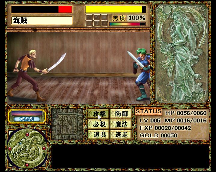Ōdō Yūsha centers on a classic turn-based RPG system with a single hero (default name Zanba) at its core. From the moment you awaken without a past, you’ll spend hours battling foes, collecting treasure, and honing your stats. The pacing strikes a familiar JRPG rhythm: explore, encounter, grind, advance. While exploration is mostly menu-driven, the inclusion of an auto-map and location preview window keeps navigation straightforward and helps you plan your next move with minimal confusion.