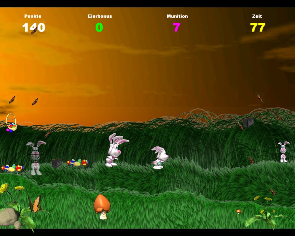Osterballerei unfolds as a fast-paced first-person shooting gallery that places precision and speed at its core. Using only your mouse, you guide a crosshair over a vibrant, Easter-themed backdrop and aim at a rotating selection of targets ranging from colorful eggs to hopping bunnies. Each session lasts exactly 90 seconds, pushing you to rack up as many points as possible before the clock runs out.