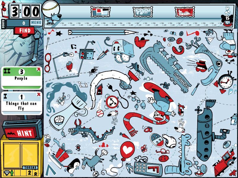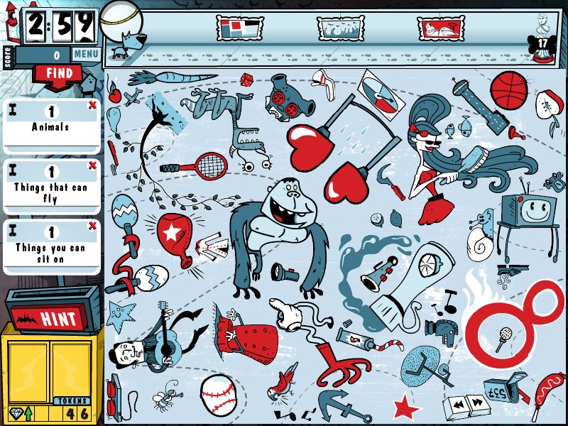 Pictureka! Museum Mayhem offers a fast-paced hidden-object challenge that translates the tactile fun of the board game into an interactive digital experience. On each level, your main screen is cluttered with dozens of whimsical items—everything from antique clocks to rubber ducks—while a timer, hint button and a series of cards line the margins. Your goal is simple but addictive: identify and click on all the objects that match the category shown on the current card before time runs out.