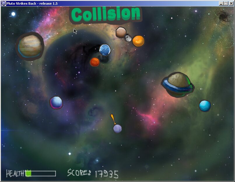 The visual presentation of Pluto Strikes Back strikes a fine balance between cartoonish charm and stellar spectacle. Planets are lovingly stylized, each sporting exaggerated features—Jupiter’s swirls look like whipped cream, while Mars shows off battle scars from previous cosmic hits. The backgrounds are vibrant, using deep blues and purples to convey the infinite reaches of space while animated starfields pulse gently in the distance.