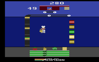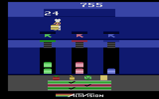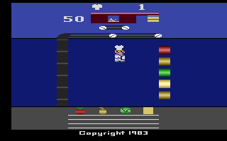 Pressure Cooker delivers a high-intensity arcade experience that tests your reflexes and multitasking skills. As the cook at “The Grille,” you must assemble a steady stream of hamburgers to match customer orders displayed at the bottom of the screen. Each order may call for tomatoes, onions, lettuce, or cheese in addition to the patty, and it’s your job to catch these ingredients as they shoot out of the dispensers on the right side of the screen.