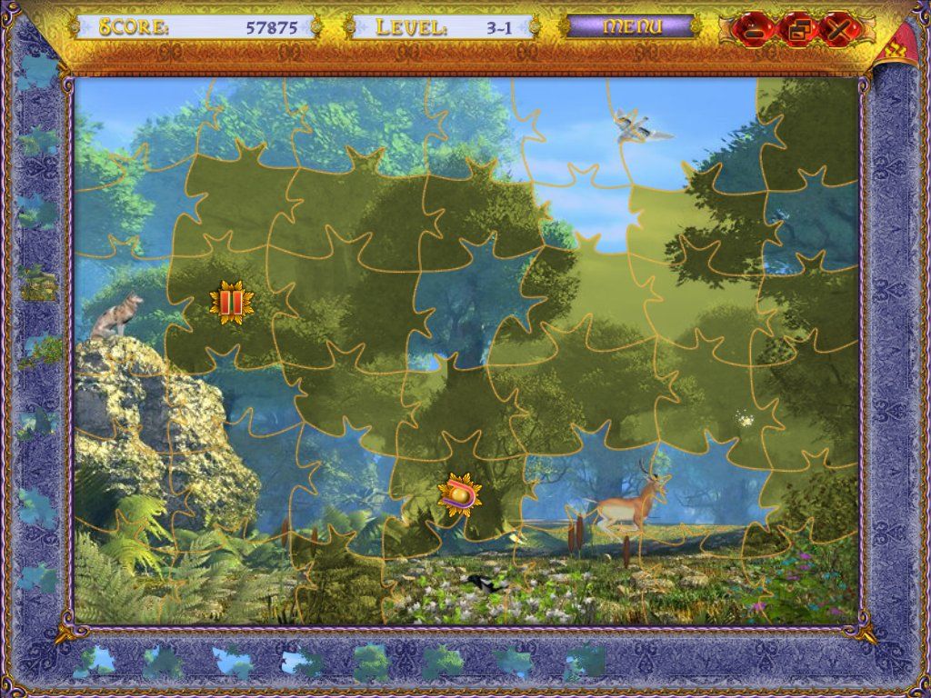 The visual presentation in Puzzle Mania: Chronicles of the Unicorn is both elegant and functional. Each puzzle begins as a lightly shaded photograph with faint jigsaw outlines, which clearly indicates where pieces should go. The colored fragments stand out against the muted background, ensuring that even the most subtle image details remain visible as you race to complete the puzzle.