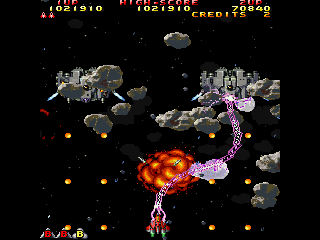 Power-ups play a pivotal role in bringing variety to the gameplay. Collecting weapon pods upgrades your main fire into more potent configurations, while bombs clear the screen of weaker enemies and projectiles in a pinch. Managing these resources is crucial; hold onto a bomb for emergencies, but don’t hesitate to use it when you’re cornered by fast-moving alien squadrons. This balancing act between conserving and deploying power-ups adds a layer of strategy to the otherwise breakneck pace.