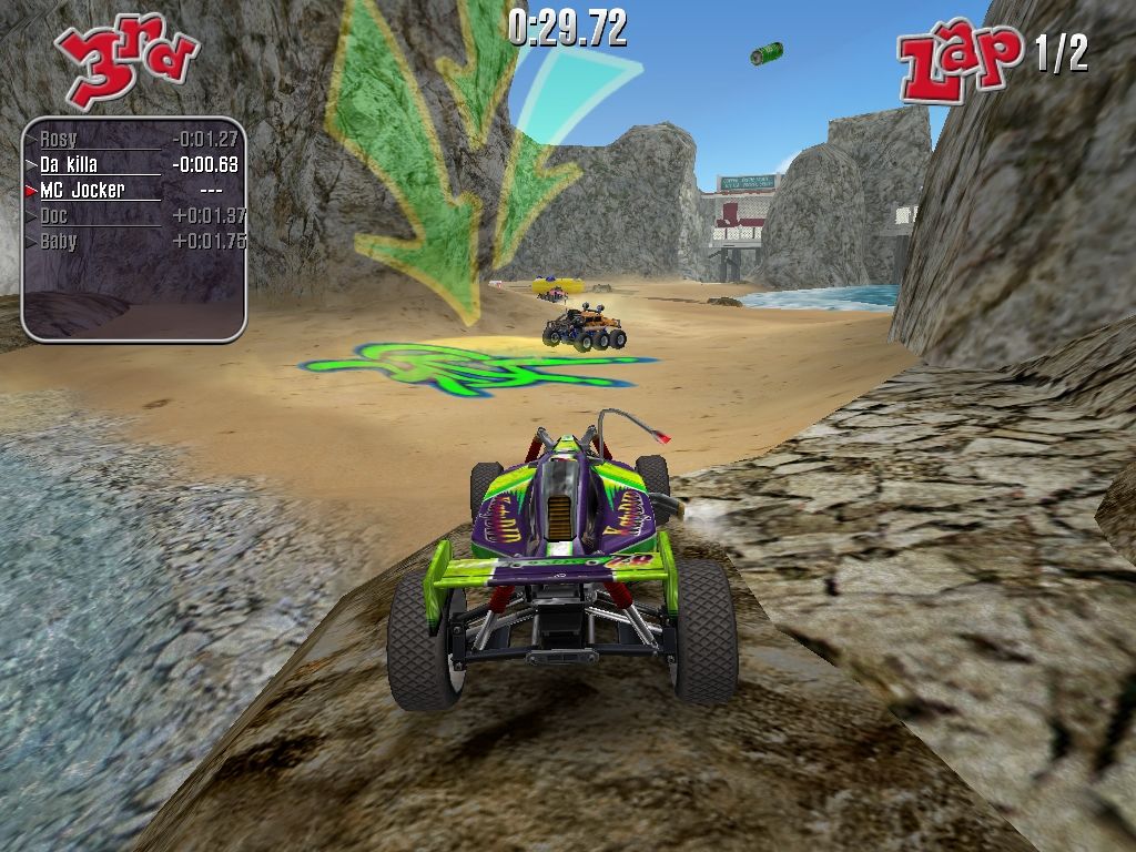 Visually, RC Cars surprises with its attention to environmental detail. The beach track features glistening water reflections, shifting sand textures, and crashing waves that serve as both spectacle and obstacle. Meanwhile, the military base track showcases rusty vehicles, shipping containers, and wide-open runways, each rendered with convincing scale and lighting. These varied backdrops keep races fresh and immersive.