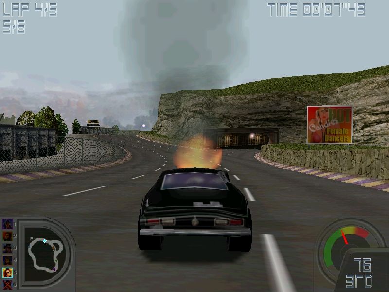Weapon effects are a highlight: muzzle flashes from gatling guns, missile trails, and fiery explosions feel weighty and impactful. Oil slicks glisten convincingly when your vehicle spins out, and land mines erupt in a shower of debris that can send opponents careening into guardrails. The sound design complements the visuals, with engine roars and weapon blasts that immerse you in the mayhem.