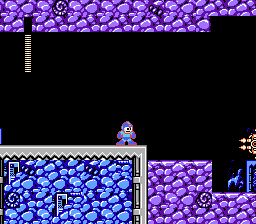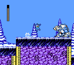 Stage environments are pared down but recognizable—icy caverns, rusted junkyards, and cloud-swept fortresses all make an appearance in 8-bit form. Some detail from the SNES version’s backgrounds and the Robot Museum stage is sacrificed, but the streamlined visuals keep the action legible, even when the screen fills up with enemy projectiles. You may notice occasional sprite flicker or slowdown when too many objects appear, but this quirk enhances the authentic Famicom experience.