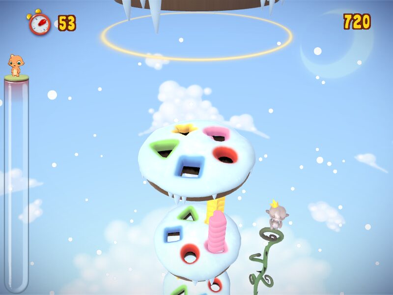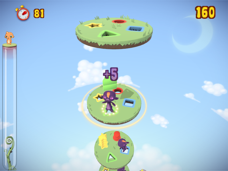 Roogoo sports a cheerful, colorful art style that’s both charming and functional. The spherical platforms float against vibrant backdrops of Planet Roo’s skies, and each block shape is rendered clearly, ensuring you always know where to aim. Subtle particle effects accompany each successful drop, while missed blocks burst into animated fragments, providing satisfying visual feedback.