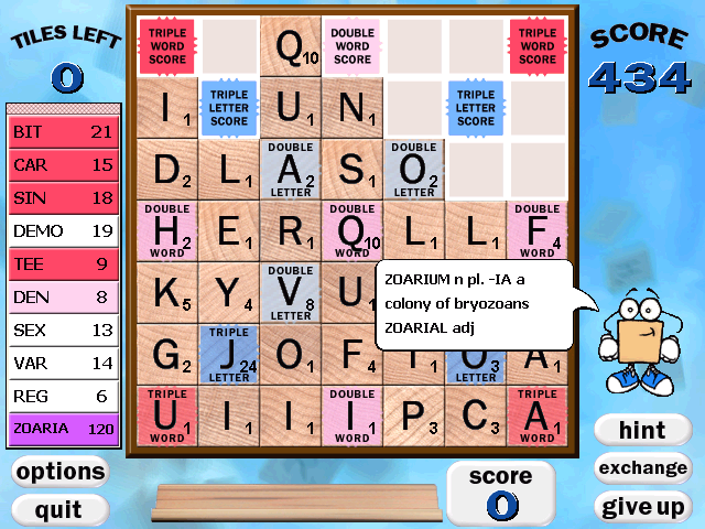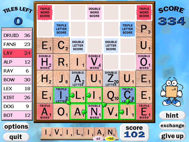 Complementing these modes are bonus multiplier squares—letter and word bonuses that can stack for spectacular scores—plus a one-time board-replacement “exchange” option to rescue you from dire jams. If you ever get truly stumped, Maven, the built-in Scrabble AI, offers tiered hints and full word reveals, and can even provide dictionary definitions and grammatical notes on demand. A robust leaderboard system tracks global and per-player highs in each mode, ensuring a persistent drive to outscore yourself and others.