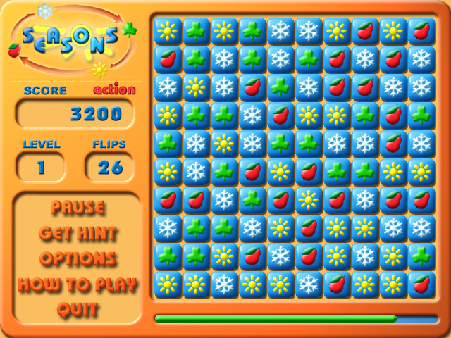 Visually, Seasons leverages its seasonal theme to great effect, with each chip type sporting vibrant, distinct color palettes. Spring chips blossom in pastel greens and pinks, summer chips shine with warm oranges and yellows, autumn chips display rich reds and browns, and winter chips glisten in icy blues and whites. The palettes are eye-catching without ever clashing, ensuring that you can instantly recognize matching pieces even in the heat of a fast-paced cascade.