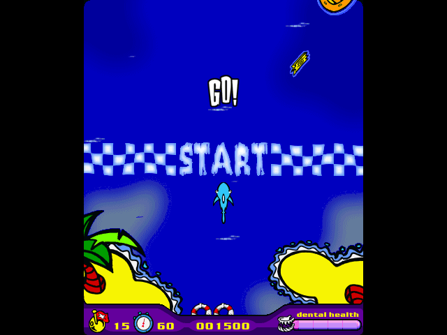 Shark Attack! delivers a refreshingly dynamic gameplay loop by alternating between two distinct modes: Race and Deep Sea. In the Race sections (levels one and three), your goal is to navigate a voracious shark through a series of buoys under a strict time limit. Colliding with obstacles or letting the scenery sap your energy adds a layer of risk versus reward, forcing you to plan your route carefully while maintaining top speed. The sense of urgency is palpable as you dart between checkpoints, each successful buoy collection pushing you closer to the finish line.