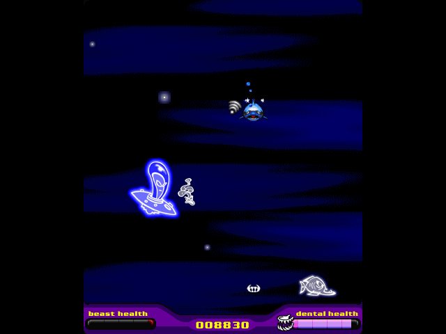 The Deep Sea stages (levels two and four) shift the focus to combat, transforming the game into an undersea shooter. Armed only with your razor-sharp teeth, you blast through schools of hostile creatures that swarm from all directions. Managing ammunition—your supply of teeth—becomes critical, as overzealous chomping drains resources and leaves you vulnerable. Along the way, tension builds as you descend deeper into the ocean’s darkness, culminating in an epic boss battle at the bottom of the sea.