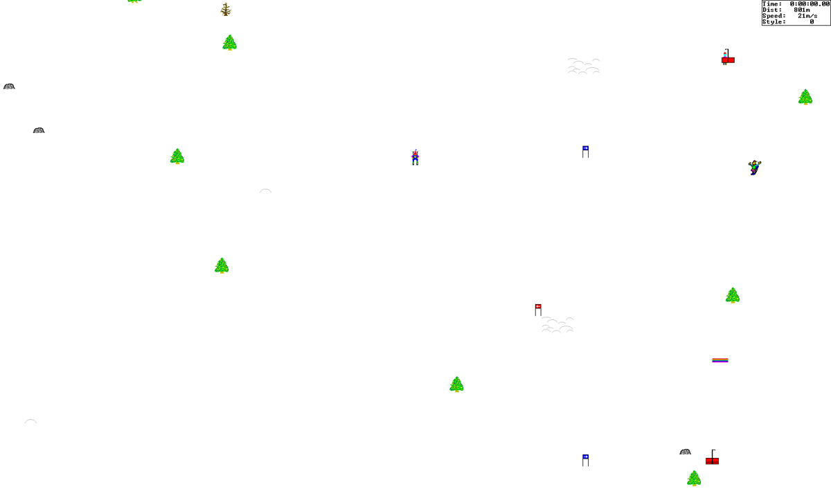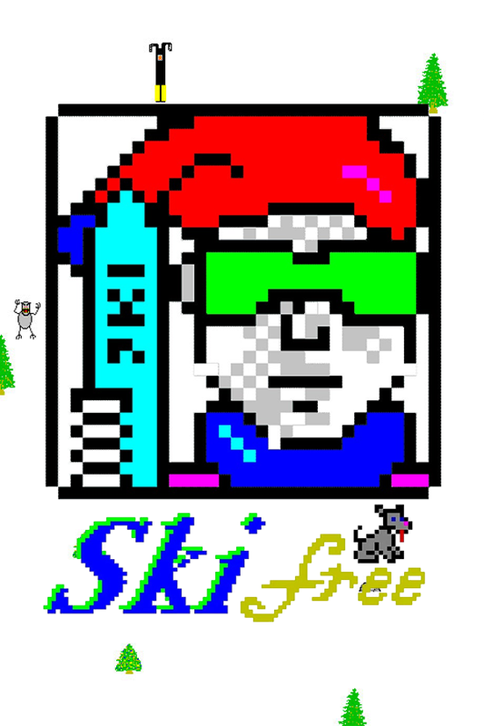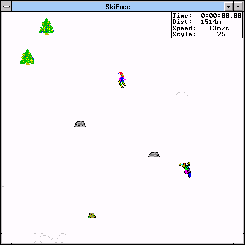 Despite its early-’90s origins, SkiFree’s pixel art style has retained a charming, retro aesthetic. The bright white of the snow contrasts crisply with the green pines, red gates, and the rainbow-coloured ramps that dot the course. Everything is rendered with clear, bold colors, making it easy to distinguish obstacles like trees, rocks, and other skiers even at quick glance. The minimalist visuals give the game its distinctive, nostalgic look.