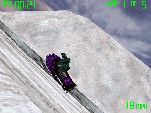Snowmobile Championship 2000 places you behind the throttle of a high-powered snowmobile as you compete against four AI opponents across eight unique winter landscapes. From the jagged peaks of the Canadian Rockies to the serene Japanese Field, each track demands a different approach. Choosing between the mogul-strewn paths and the smoother landlocked routes becomes a key strategic decision—race over the bumps to shave off time or skirt around them to maintain your speed.