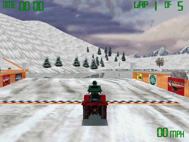 Graphically, Snowmobile Championship 2000 sits firmly in the bargain-bin bracket, yet it delivers surprising charm. Whipped-cream snowbanks, glistening ice patches, and mud-laden sections are distinct from one another, helping you anticipate the terrain ahead. At the maximum detail setting, textures are reasonably crisp, and distant trees or mountains render with enough fidelity to provide genuine immersion.