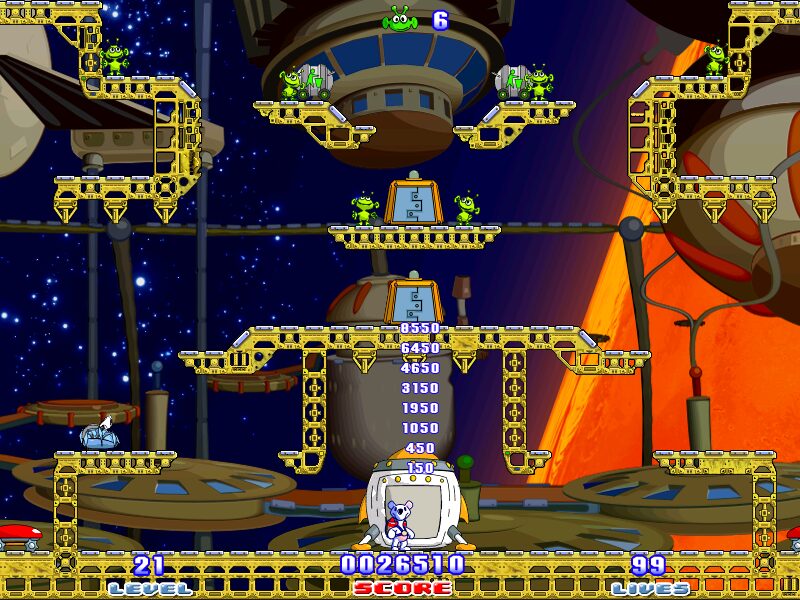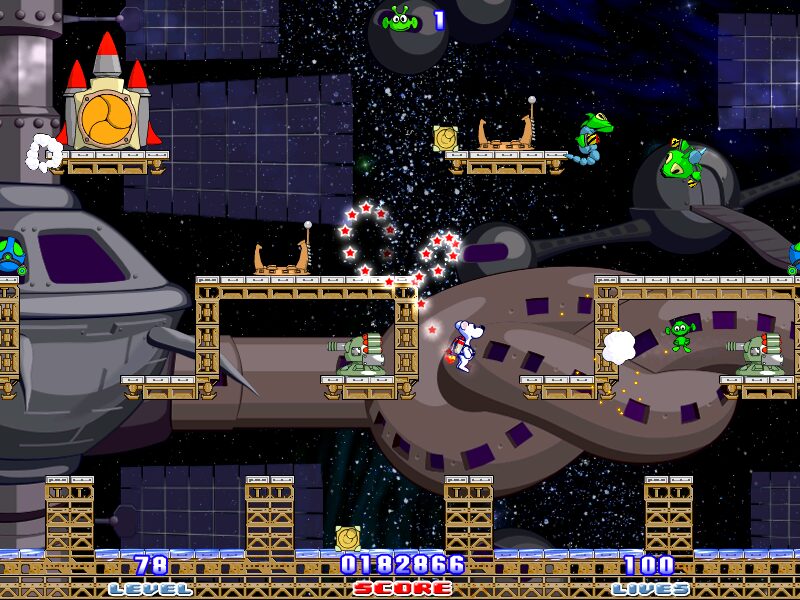 Snowy: Space Trip puts a fresh spin on the classic platform-rescue formula, tasking players with guiding Snowy through eighty intricately designed levels. The core objective is simple: locate the lost aliens, convince them to follow you, and shepherd them safely back to your rocket. Along the way, you’ll navigate tight corridors, dodge mounted blaster cannons, and outmaneuver patrols of menacing robots. It’s a careful balance of timing, strategy, and quick thinking.