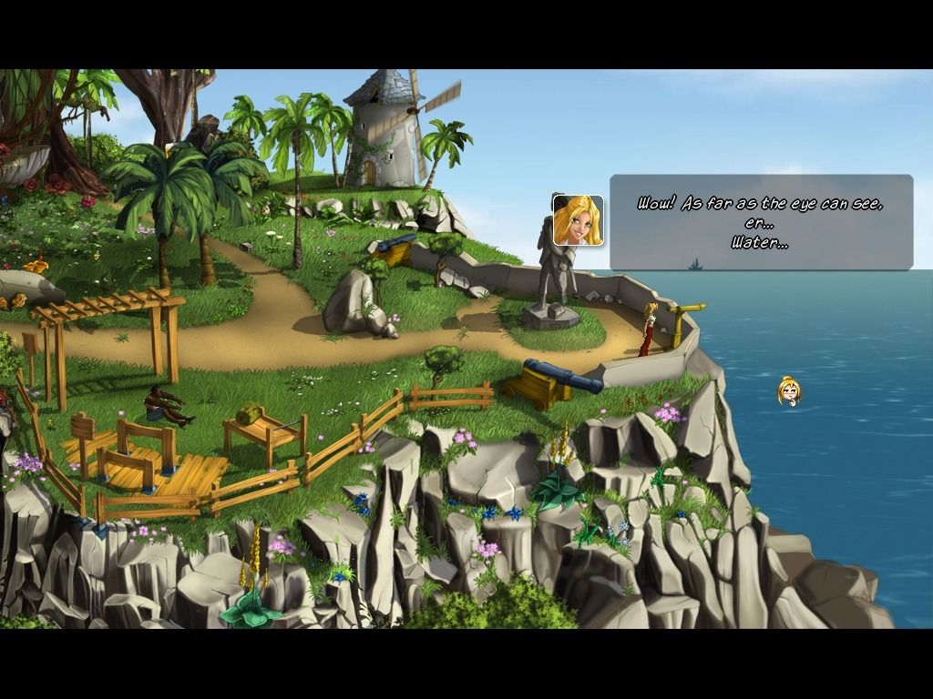 Visually, So Blonde adopts a vibrant, cartoon-inspired art style that meshes surprisingly well with its tropical pirate setting. The backgrounds are richly detailed, from sun-bleached beaches to shadowy coves, with colors that pop without ever feeling garish. Character portraits in dialogue frames are expressive, enhancing the game’s playful, tongue-in-cheek tone.