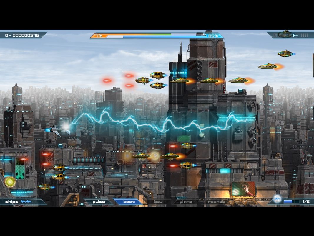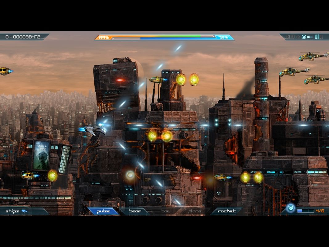 The five upgradeable weapons—pulse, beam, bow, flame, and rocket—add strategic depth to every encounter. As you swap between loadouts, you must also manage the weapon “coolness” bar, which depletes with use and forces you to rotate tactics on the fly. This heat mechanic elevates the standard shoot-’em-up template, rewarding players who balance offense and cooldown windows for maximum efficiency.