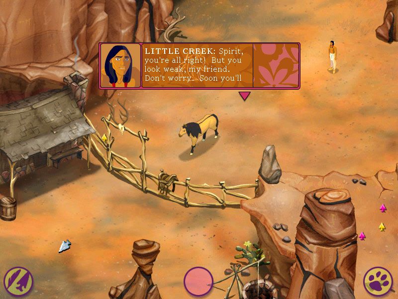 Mission structure is chapter-based, mirroring key moments from the animated feature. Early levels task you with locating scattered herd members after a violent storm, sending you on exploration hunts through varied terrain. Later chapters introduce stealth sections where Spirit must evade cowboys or stampede buffalo herds in timed sequences. Each objective is clearly communicated by in-game allies Little Creek and Little Brook, and success often relies on reacting quickly to on-screen cues and using Spirit’s unique abilities strategically.