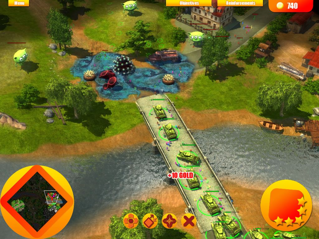 User interface elements are clean and straightforward. Reinforcements and special powers occupy the top-right corner, while the bottom panel displays unit info, command buttons, and the mini-map. Everything is color-coded and icon-driven, so even strategy novices who “hate the genre” can dive in without confusion. The graphical style may not win awards, but it delivers on charm, humor, and readability.