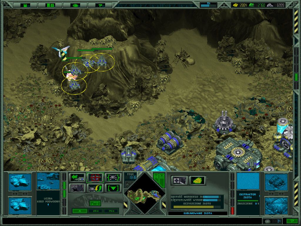 The title features three robust single-player campaigns—White Sharks, Black Octopi, and the alien Silicons—each offering ten missions that progressively develop faction-specific strengths. Human factions rely on construction submarines to seed buildings that then autonomously finish construction, while the Silicons deploy self-transforming capsules. This structural diversity keeps base management engaging, as players must balance resource intake, unit production, and defensive planning. Special units like Marauders (capable of capturing enemy vessels), Avengers (disabling opponents), and Dreadnoughts (bombarding from above) demand strategic foresight and create memorable battlefield moments.