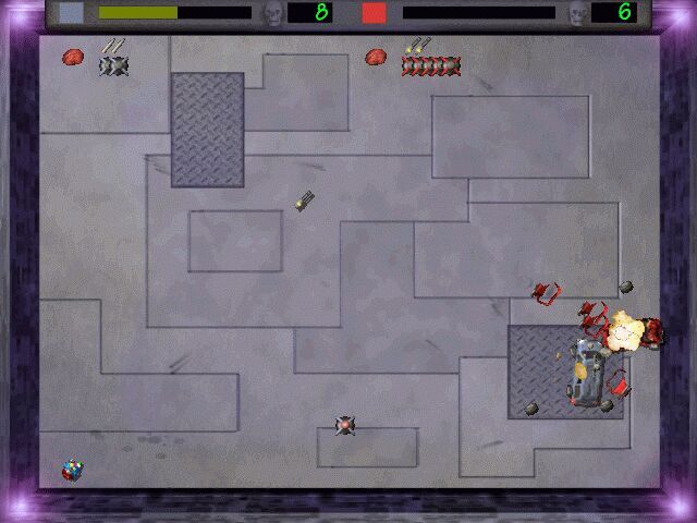 The weapon roster includes a machine gun for constant chip damage, a rocket launcher that fires in volleys, a guided missile for high-precision strikes, and deployable mines for area denial. A first aid kit power-up can also appear, offering critical health restoration at the right moment. Balancing aggressive play with tactical pickups adds surprising depth: do you kamikaze crash into your rival or wait to pick off their last sliver of health with a guided missile?