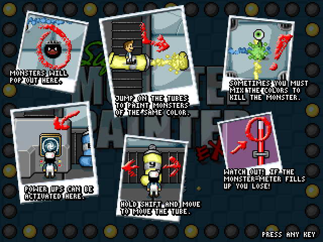 Animations are fluid and full of personality. Paint splatters drip realistically, pooling at the edges of conveyor belts, while monsters quiver and flash when hit. The characters themselves have snappy jump animations and expressive idle poses that make the single-screen action feel alive. Even under the most paint-soaked onslaught of Wave Ten, the game maintains smooth frame rates and clear visual feedback.