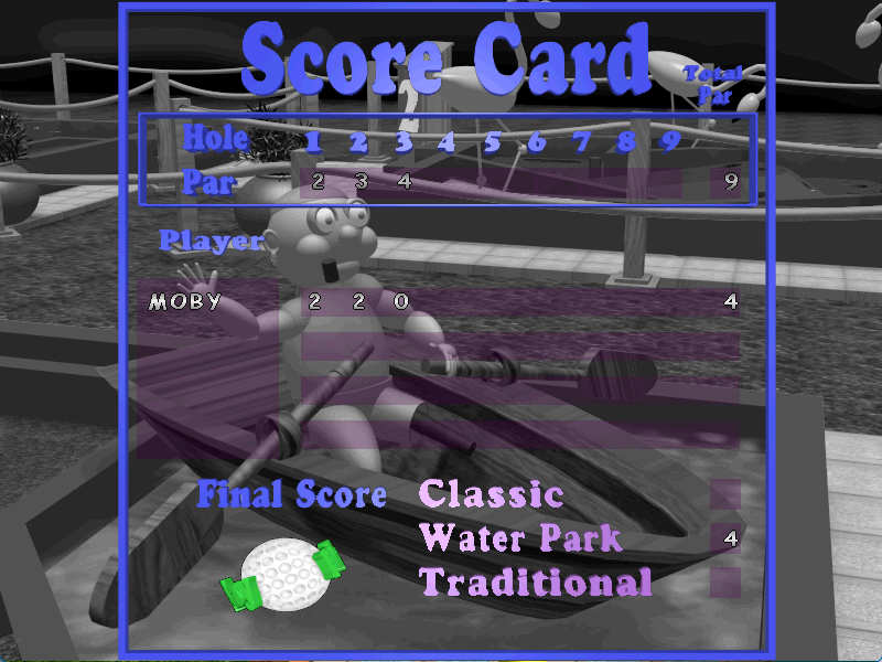 Textures and course themes are distinct: the Water Park features vibrant blues and playful slides, the Traditional course boasts neatly trimmed greens and realistic sand traps, and the Classic layout leans into muted tones and gentle curves. Each environment feels carefully crafted, with just enough detail to be engaging without overwhelming the screen. Frame rates remain stable even during 3D sequences, ensuring smooth play on modest hardware.