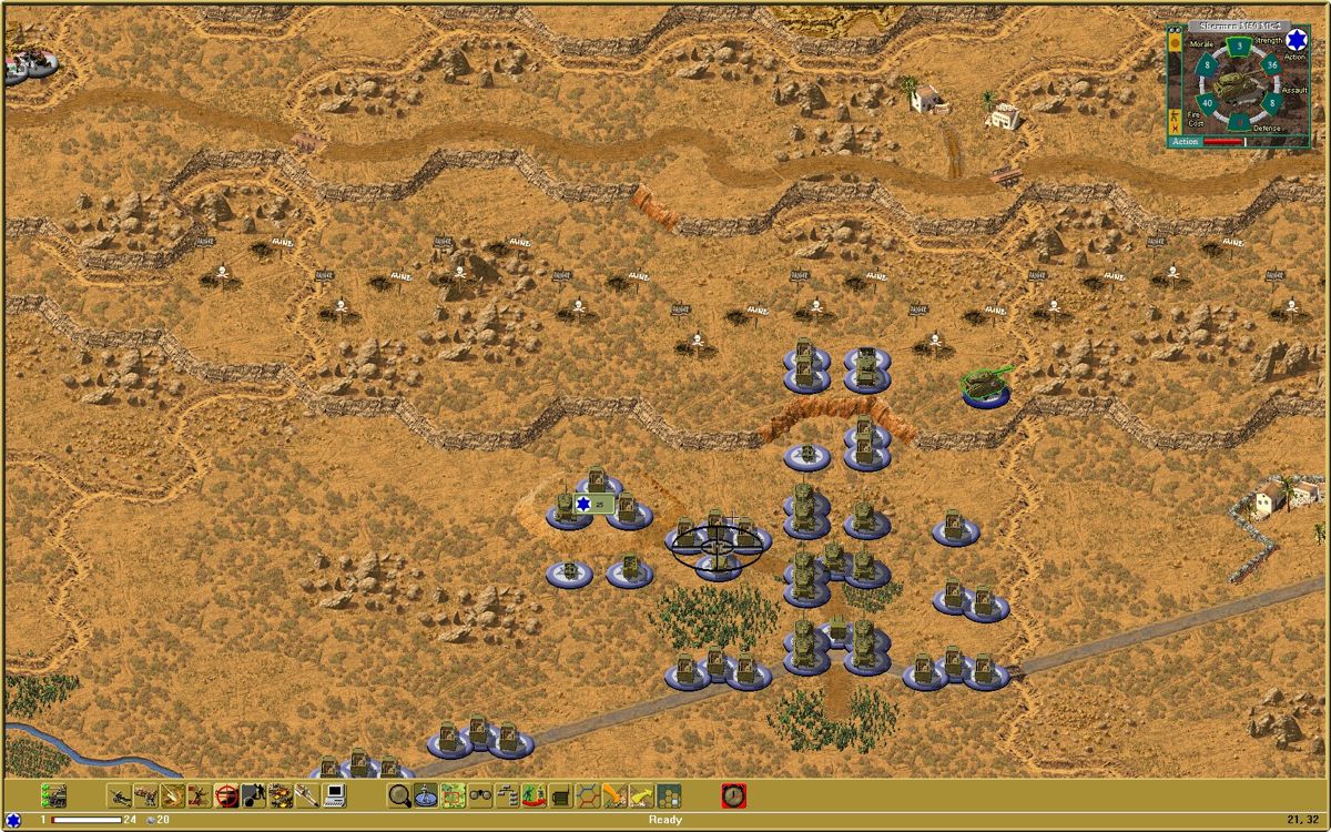 Graphically, Divided Ground embraces a utilitarian aesthetic that prioritizes clarity over flashy effects. The isometric map tiles are richly detailed, with terrain features such as deserts, wadis, and urban ruins rendered in distinct color palettes to aid quick recognition. Unit icons are small but distinct, each carrying a clear symbol denoting type, nationality, and combat readiness.