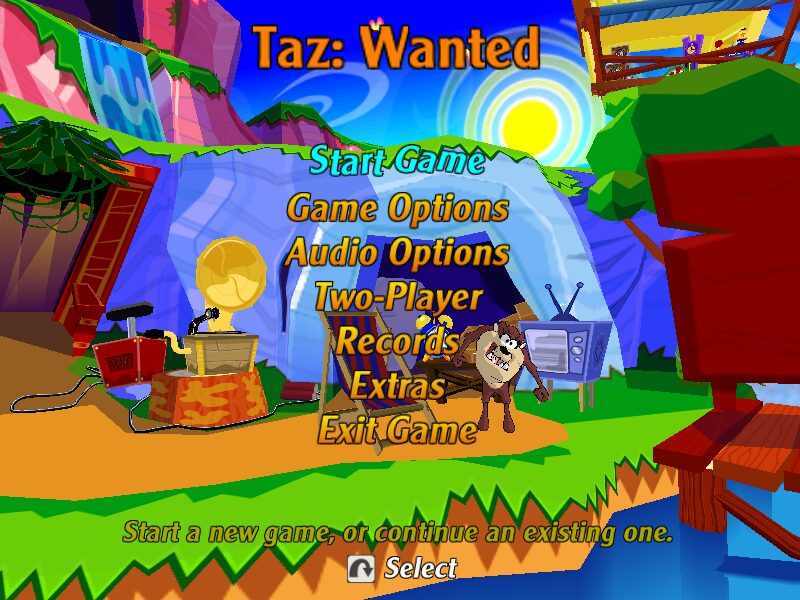 Menus and HUD elements follow the same playful aesthetic, featuring bold fonts and themed icons for your chili and soda pickups. Level transitions are punctuated by short cinematic cut-ins of Taz roaring or Sam cackling, which further reinforce the game’s Looney Tunes spirit.