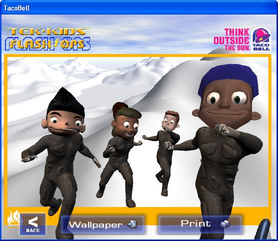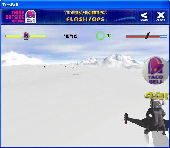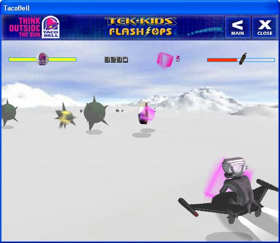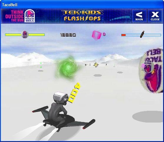 Visually, Polar Challenge leverages Flash’s capabilities to deliver crisp, cartoon-style graphics that appeal to younger audiences. The icy backdrop is rendered in a palette of cool blues and whites, punctuated by the vivid orange of the Taco Bell branding. Character sprites for the Tek Kids are simple but well-defined, ensuring you can tell each operative apart even at high speeds.