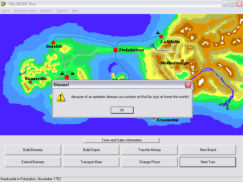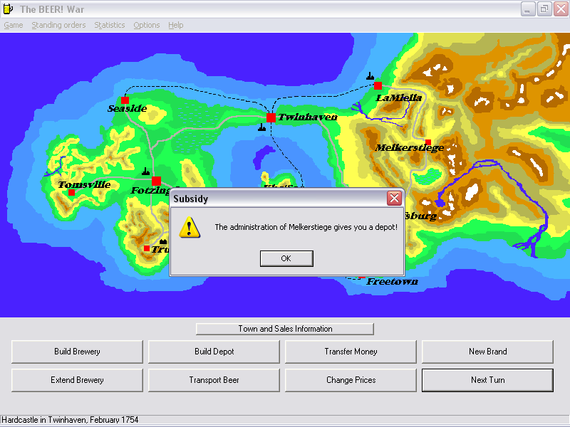 Visually, The BEER War! embraces a classic 2D shareware aesthetic, featuring a clean, color-coded map of ten towns dotted with factory and depot icons. While it doesn’t boast modern 3D models or high-definition textures, the straightforward presentation allows you to focus on strategic decisions without distraction. Each town’s icon conveys vital information at a glance—market size, prevailing income levels, and current brand saturation.