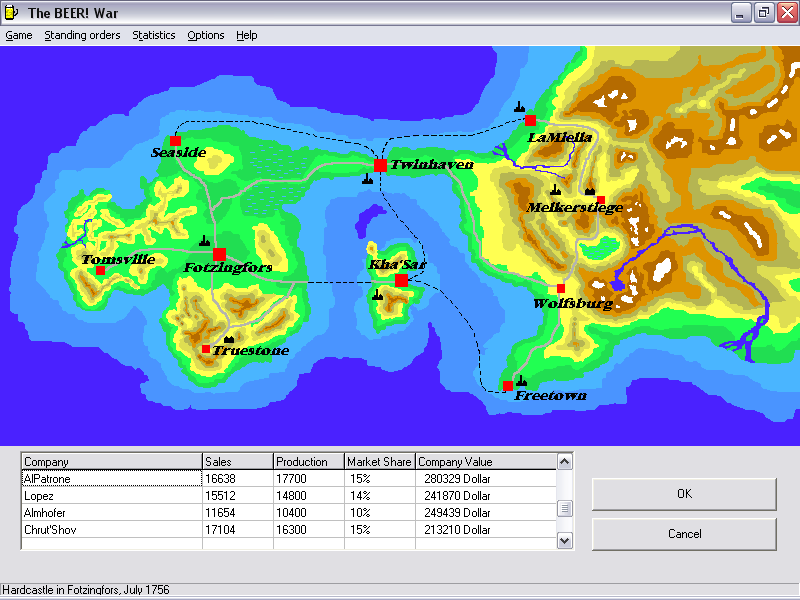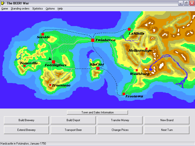 The BEER War! throws you into the high-stakes world of beverage warfare, tasking you with managing your own beer company against nine ruthless competitors. From the very first turn, you’ll be balancing production, distribution, and price strategies across ten distinct towns. Each city’s unique demographic—ranging from affluent suburbs to working-class strongholds—demands a tailored approach, ensuring no two campaigns play out the same way.