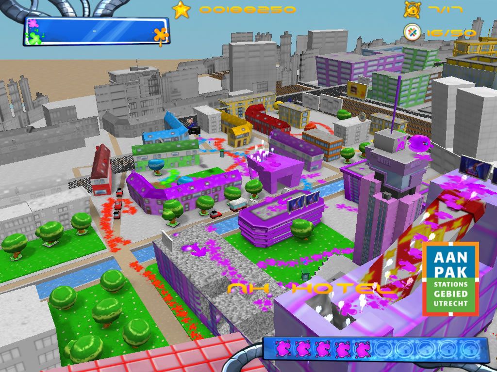 The narrative framework of The Blob! is delightfully straightforward: a lone alien’s crash-landing on Earth brings the mission to paint a dreary city back to life. There’s minimal dialogue or cutscene exposition, but the premise is clear and charming—your crash in Utrecht sets the stage for a colourful reclamation project. This low-key storytelling allows the focus to remain squarely on gameplay while still giving context to your painting spree.