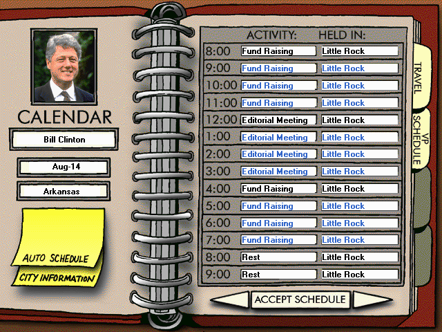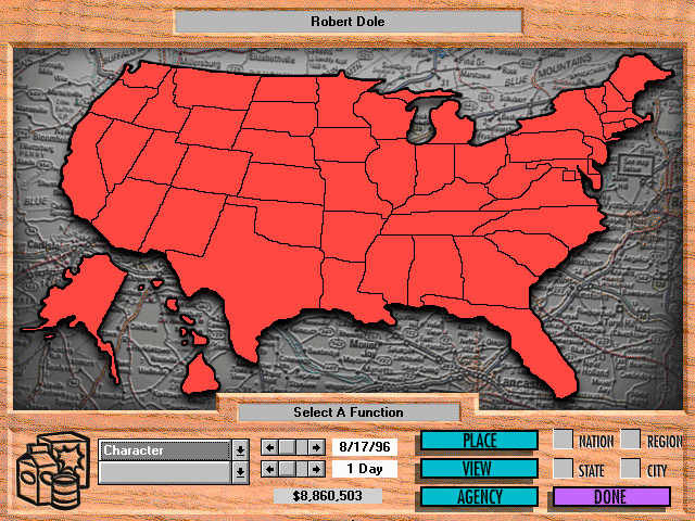 While The Doonesbury Election Game Campaign ’96 doesn’t boast cutting-edge visuals by today’s standards, its graphics perfectly capture the mid-’90s aesthetic. The user interface is colorful and cartoonish, reflecting Garry Trudeau’s original comic strip’s style. Icons for campaign offices, polling data, and candidate portraits are immediately recognizable and charmingly rendered.