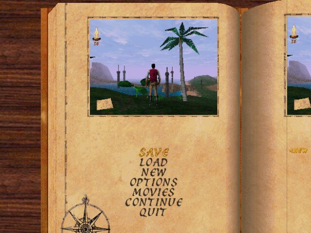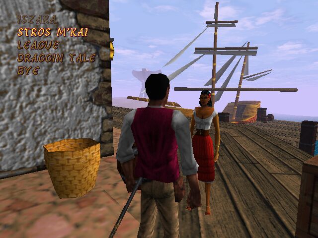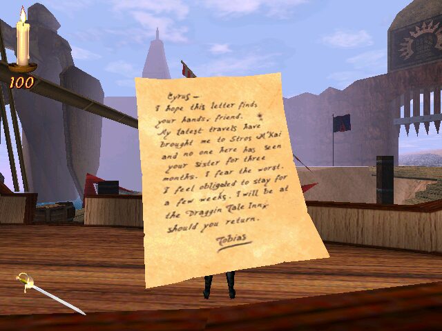 Redguard’s visuals capture the late-90s era of early 3D adventure gaming with a blend of real-time character models and richly painted backgrounds. Stros M’Kai’s sun-baked stone walls and bustling market stalls are rendered in bright, saturated hues that bring the border city to life. The coastline shimmers with animated waves, while palm trees sway gently—reinforcing the city’s desert-meets-ocean ambiance.